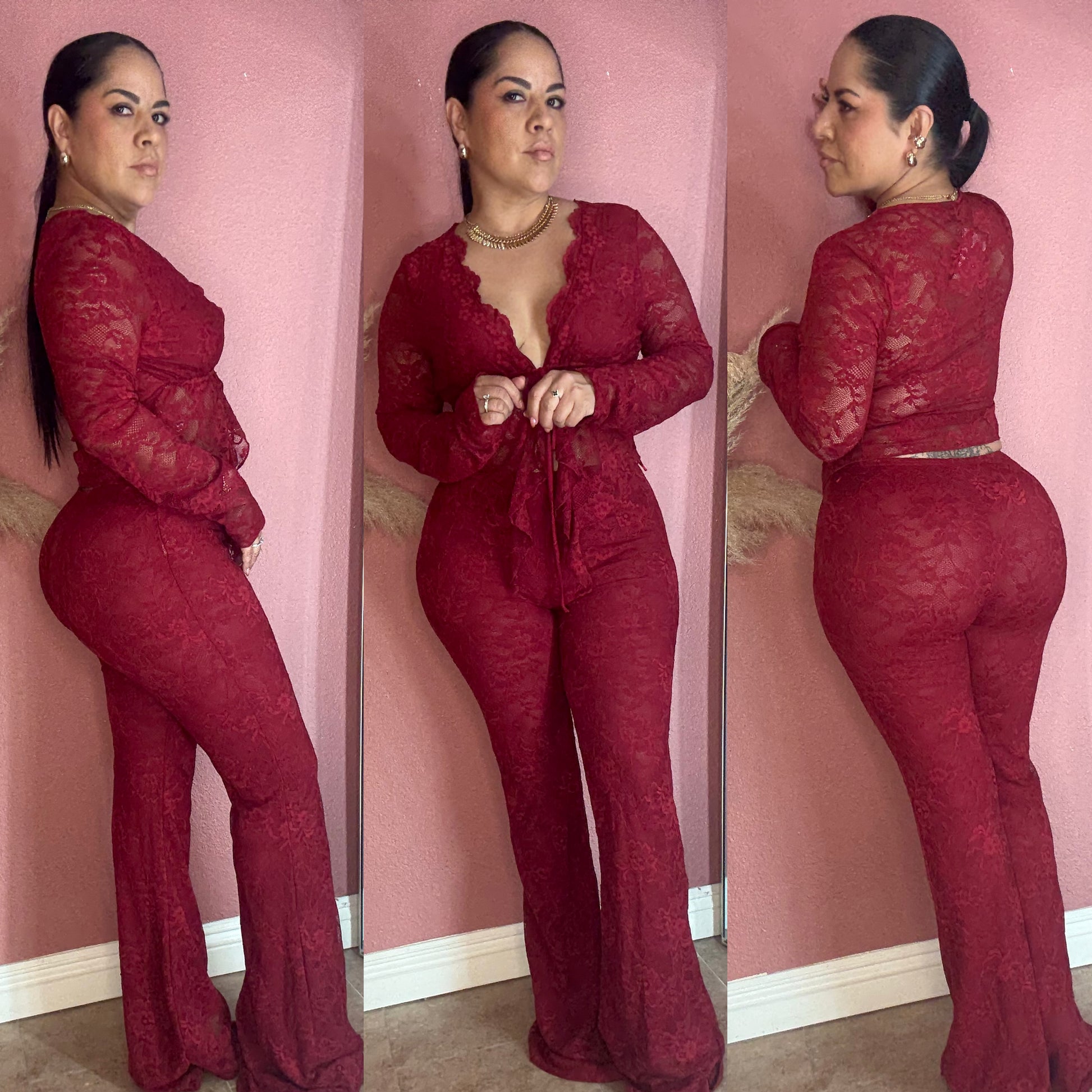 Step into pure sophistication with our Burgundy Lace Two-Piece Set, crafted for women who love a romantic, feminine, and figure-enhancing look. This stunning set features a sheer lace long-sleeve top with a deep scalloped neckline and a front tie closure that adds a charming, flirty touch. Paired with matching high-waisted lace pants that hug your curves and flow gracefully at the bottom, this outfit offers elegance from every angle.